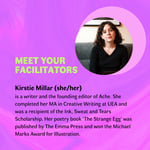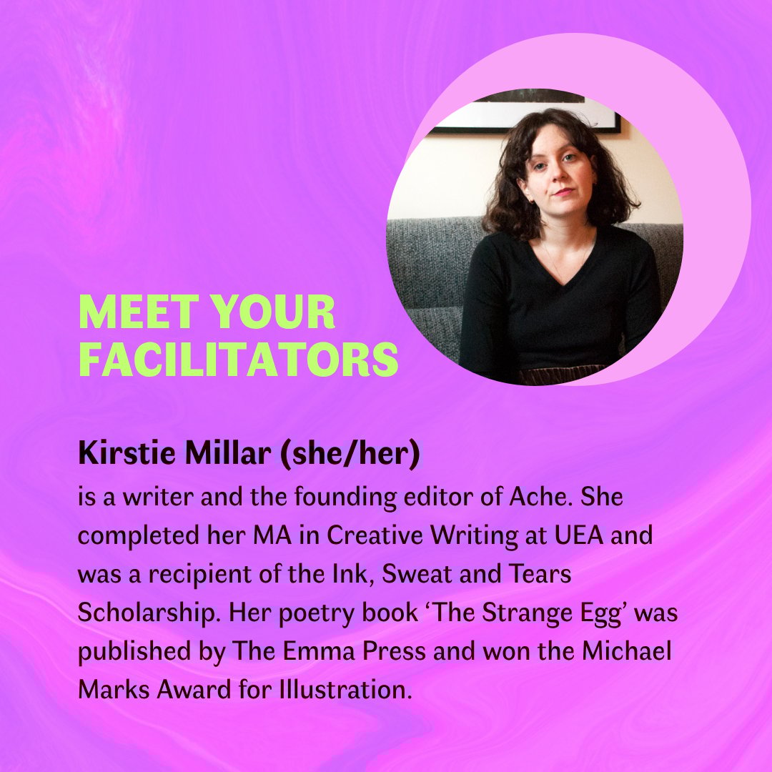 Kirstie Millar is a writer and the founding editor of Ache. She completed her MA in Creative Writing at UEA and was a recipient of the Ink, Sweat and Tears Scholarship. Her poetry book The Strange Egg was published by The Emma Press and won the Michael Marks Award for Illustration.